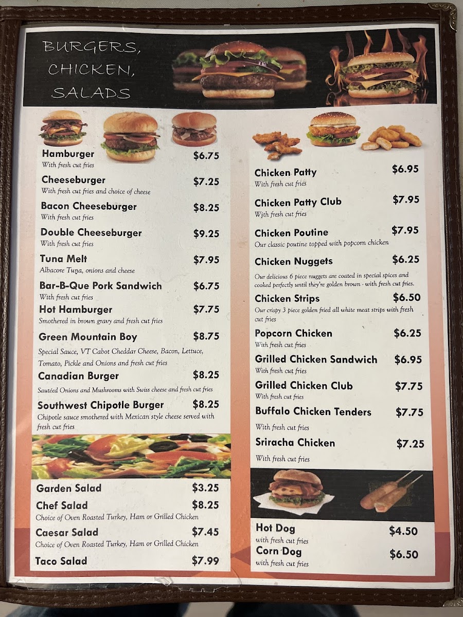 Fresh, hand-formed patties hot off the grill and placed on a soft, toasted Kaiser bun, Special Sauce, VT Cabot Cheddar Cheese, Applewood Smoked Bacon, Lettuce, Tomato, Pickle and Onions. All burgers are made with 100% REAL beef. Served with fresh hand-cut fries.